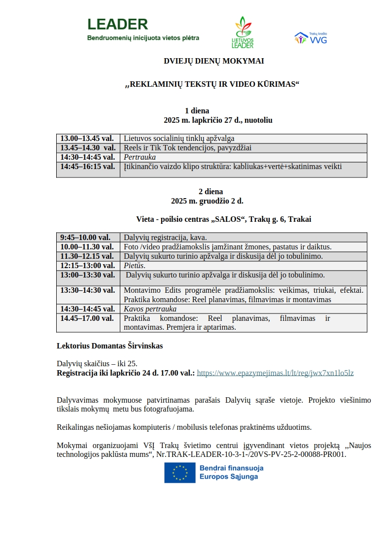 VšĮ Trakų švietimo centras lapkričio 27 d. (nuotoliu) ir gruodžio 2 d. Trakų poilsio centre „SALOS“ (Trakų g. 6, Trakai) kviečia į mokymus „Reklaminių tekstų ir video kūrimas“.